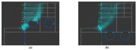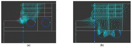 According to the analysis in Section 3.1.1 above, the failure mechanisms under stage (1) and stage (2) are relatively similar. The twin shield tunnels collapse first under stage (1) and stage (2). As horizontal distance L increases, foundation pit will be outside failure zone of twin shield tunnels. In the following figures, the blue structures show the underground diaphragm wall and shield tunnels, respectively. The different colors of the shear dissipation contours represent the value of the shear dissipation energy. The shear dissipation energy is larger when the color of the shear dissipation contours is more approximate to red. Besides, the green arrows represent the incremental displacement vectors of soils. Taking stage (2) as an example, the shear dissipation contours in Figure 13 and the incremental displacement vector in Figure 14 show that the stability of the twin shield tunnels will no longer be affected by the foundation pit as L increases to 0.5 H. In this case, global stability problem has been completely transformed into the stability problem of the twin shield tunnels. Different from stage (1) and stage (2), according to the analysis in Section 3.1.1 above, the foundation pit collapses first under stage (3) and stage (4). Taking stage (4) as an example, the shear dissipation contours in Figure 15 and the incremental displacement vector in Figure 16 show that the twin shield tunnels have been completely outside the failure zone of the foundation pit when the horizontal distance L increases to 1.0 H, and the global stability problem has been completely transformed into the stability problem of the foundation pit.
