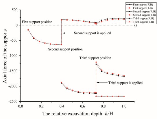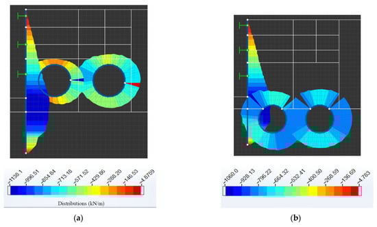 In Figure 11, the different colors of the axial force diagram represent the value of the axial force. The absolute value of the axial force is larger when the color of the shear dissipation contours is more approximate to blue. As can be seen from Figure 11, axial force of the enclosure structure in each stage increases with the increase in excavation depth. The axial force of enclosure structure in stage 1 and stage 2 is mainly affected by twin shield tunnels. From the beginning of stage 3, the axial force is greatly influenced by the excavation itself, and the position of the extreme value of axial force gradually progresses downward. The maximum axial force occurs in stage 4.