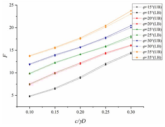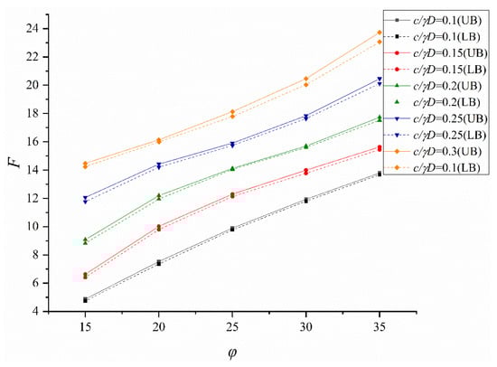 Figure 32 shows the influence of c/γD on the safety factor, and curves of the upper and lower bounds of the safety factor under different φ are drawn in the figure. The data in the figure show that there is a nonlinear relationship between c/γD and the safety factor F. With the increase in c/γD, the safety factors under five different φ will all increase nonlinearly.