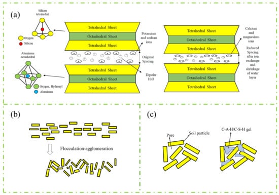 Ion exchange is the primary reaction involved in stabilizing industrial solid wastes, impacting their plasticity and water stability in the short term. As illustrated in Figure 3a, alkaline oxides such as CaO and MgO react with water to form Ca2+ and Mg2+ ions, which replace K+ and Na+ ions in the clay particles via ion exchange. This process reduces the thickness and spacing of the water film between soil particles []. Experimental studies conducted have demonstrated that the addition of fly ash effectively reduces plasticity and swelling resulting from cation exchange reactions [,]. Furthermore, the alkaline environment produced by fly ash hydration promotes ion exchange, effectively mitigating soil swelling. Additionally, cation exchange facilitates the flocculation-agglomeration of soil particles, thereby enhancing soil strength. However, excessive cation exchange may deplete the Ca2+ and OH− ions required for the volcanic ash reaction, ultimately reducing the production of C-S-H and diminishing soil strength properties [,,].