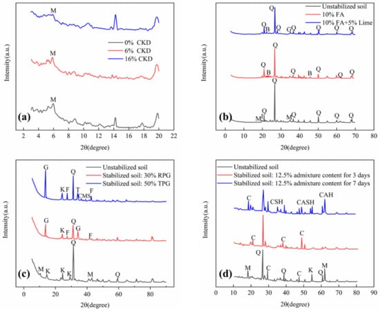 XRD pattern of expansive soil by (a) stabilized soil by CKD, (b) stabilized soil by FA, (c) stabilized soil by PG, and (d) stabilized soil by CS. Adapted from [,,,]. (Note: M: montmorillonite; B: bentonite; C: Calcite; Q: quartz; G: gypsum; K: kaolinite; F: feldspar; I: illite; T: trikalsilite; S: sillimanite; CMS: calcium magnesium silicide; CSH: calcium silicate hydrate; CASH: calcium aluminium silicate hydrate; CAH: calcium aluminium hydrate).