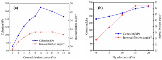 Evolution of internal friction angle and cohesion of expansive soil: (a) stabilized soil by cement kiln ash, and (b) stabilized soil by fly ash. Adapted from [,].