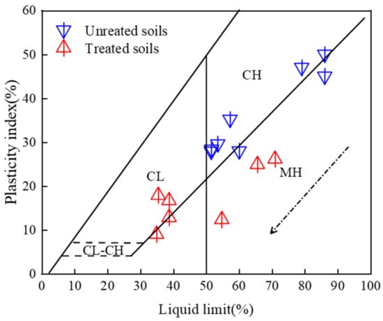 The Atterberg Limit plays a crucial role in predicting soil mechanics and hydrological behaviour, particularly for expansive soils that exhibit a higher liquid limit and plasticity index than other soil types, leading to distinct rheological properties []. Figure 7 illustrates that industrial solid waste can impact soil consistency and alter soil classification.