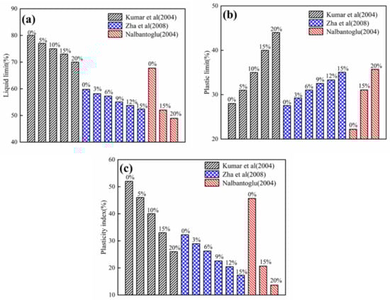 Effect of fly ash on the Atterberg limit of expansive soil (a) liquid limit; (b) plastic limit; (c) plastic index. Adapted from [,,].