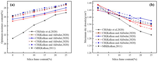 Compaction characteristics of expansive soil stabilized by silica fume: (a) optimum moisture content; (b) maximum dry density. Adapted from [,,].