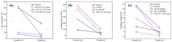 Influence of industrial solid waste on swelling and shrinkage of expansive soil: (a) free swell index; (b) swelling pressure; (c) swelling potential.