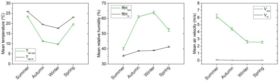 Regarding RH, the outdoor values were higher than those measured indoors, with the lowest values collected during the summer season (mean = 39.94%; SD = 12.85%; mean = 35.43%; SD = 7.48%), and the highest values during the winter season (mean = 63.92%; SD = 17.06%; mean = 38.98%; SD = 4.40%). Similar trends were also observed for air velocity, with higher values measured outdoors during all seasons. It is worth noting that there were large variations between the mean values of outdoor air temperature measured at 6:00 a.m. during the different seasons: the mean values of were 3.20 °C and 14.62 °C in the winter and summer seasons, respectively.