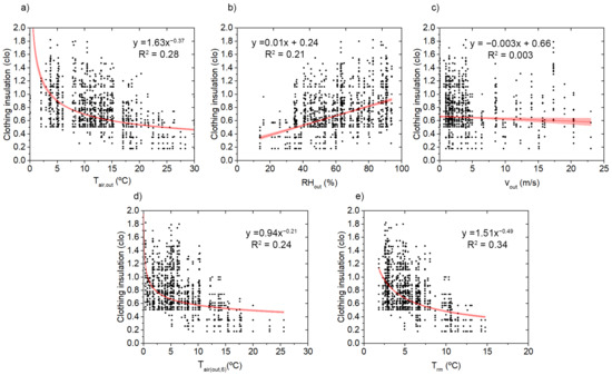 Relationship between outdoor environmental factors and clothing insulation: (a) outdoor air temperature; (b) outdoor air RH; (c) outdoor air velocity; (d) outdoor air temperature measured at 6:00 a.m.; (e) outdoor running mean temperature. The red line indicates the curve fit (95% confidence interval).