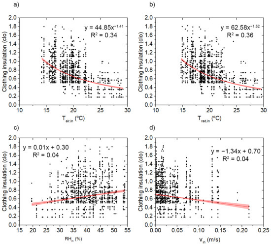 Relationship between indoor environmental factors and clothing insulation: (a) indoor air temperature; (b) indoor radiant temperature; (c) indoor RH; (d) indoor air velocity. The red line indicates the curve fit (95% confidence interval).