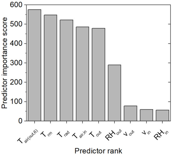 Additionally, to analyse the influence of the variability of indoor and outdoor environmental factors on the variability of the results, univariate feature ranking for regression using F-tests was used. The method employs an F-test to individually examine the importance of each predictor. The F-test assesses the hypothesis that the response values, grouped by predictor variable values, are derived from populations with identical means. The alternative hypothesis posits that the population means are not all equal. A small p-value for the test statistic indicates that the corresponding predictor is significant. Consequently, a large score value indicates that the corresponding predictor is important.