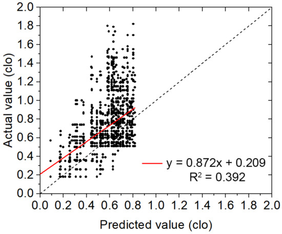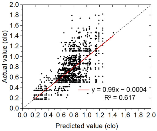 The performance of the developed model was evaluated, and the obtained results are shown in Table 6. The model performance is similar to the training and validation data (R2 = 0.624 and R2 = 0.630, respectively), with MAE and MSE also being very similar between both datasets (MAE = 0.083 and MSE = 0.013 for training data and MAE = 0.082, MSE = 0.013 for validation data). Figure 7 shows the predicted clothing insulation values obtained from the proposed ANN-based model versus the actual clothing insulation values. The linear regression shows an R2 of 0.62 between both variables.