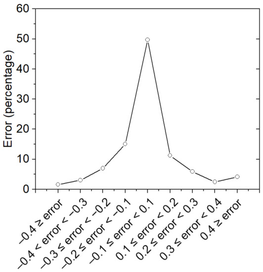 The error distribution profile of the developed model is shown in Figure 8. The accuracy of the predictive model can be assessed by comparing the difference between the predicted and actual values. Figure 8 shows that 50% of the predictive values differ by less than 0.1 clo from the actual values. This percentage increases to 76% if the range is extended from −0.2 clo to +0.2 clo. In contrast, only 11.5% and 12.5% of the predicted values overestimate or underestimate the clothing insulation by more than ±0.2 clo, respectively.