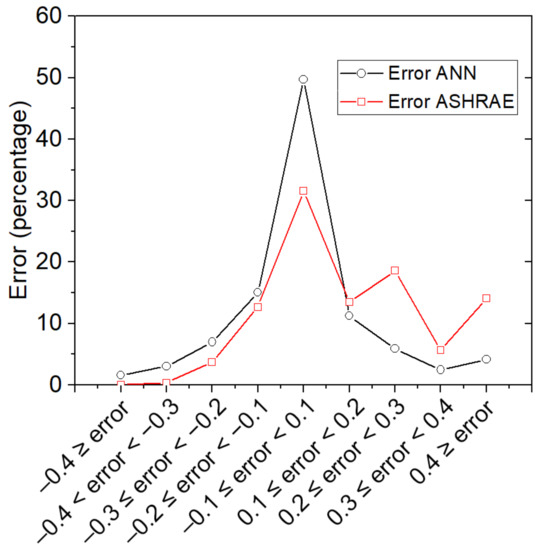 Comparison of the error distribution profile of the developed ANN-based model and the ASHRAE model.
