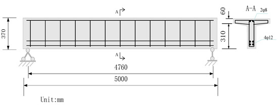 The model specimens are designed on a 1:4 scale, with a typical T-beam 20 m long as the prototype. The beam-like model spans 5 m, and the beam height, web thickness, and flange plate width are 0.37 m, 0.12 m, and 0.25 m, respectively. The tension and compression zones of the concrete T-beam specimens are reinforced with four φ12 and two φ8 reinforcing bars, respectively. Further information on the beam model, such as its size and reinforcement arrangement, is illustrated in Figure 1.