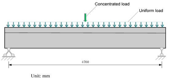 The load is converted as per the highway level in the Chinese bridge design code. The exerted load is composed of a uniform load and a concentrated load, where the uniform load after scaling is obtained as 2.625 kN/m, and the concentrated load is evaluated as 7.7 (4.4) kN for the load level of 40% (70%). Iron blocks are utilized in the test loading, and the concentrated load is composed of iron blocks piled up, and the loads are evenly distributed along the T-beam. Meanwhile, the boundary conditions of the understudied beams are simply supported. The schematic representation of the uniform and concentrated load applied on the reinforced concrete T-beam is illustrated in Figure 2.