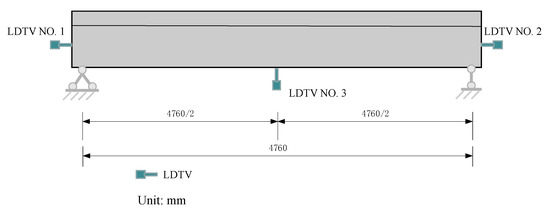 Different parameters are measured and recorded throughout the testing process, including the deflection of the reinforced concrete T-beam, steel bar strain, and temperature and humidity levels both in the laboratory environment and within the specimens. Displacement measurements are taken at the middle of the span for vertical displacement and at both ends for longitudinal displacement. The strain measurement points are arranged on the steel bars in the middle span of the T-beam. The arrangement of the displacement and strain measuring points is presented in Figure 3. The data acquisition instrument is used to collect the measured displacements and strains.