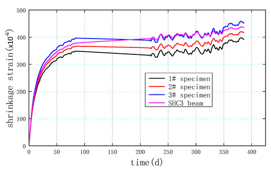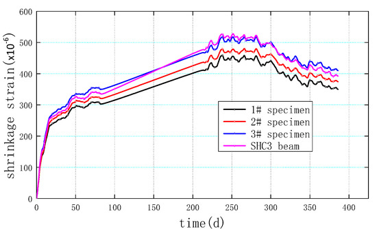 Time-history plots of the shrinkage strain of various specimens (excluding the temperature effect).