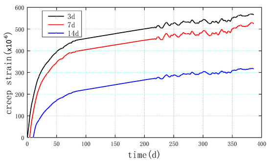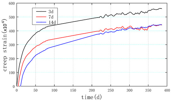Figure 8 and Figure 9 present the Time−history plots of the creep strain. The curves from top to bottom represent the plots associated with specimens of loading ages 3 days, 7 days, and 14 days, respectively. The demonstrated results show that the creep curves exhibit a rapid increase in the initial 30 days of loading and gradually become stable after 100 days. Additionally, the results show that creep strain is greater at a loading age of 3 days than at 7 days, and greater at 7 days than at 14 days. This indicates that creep strain diminishes with the increasing loading age of the specimens.