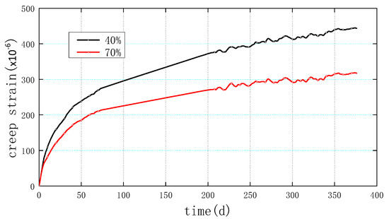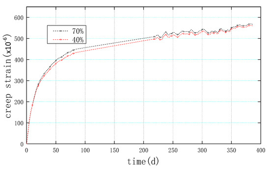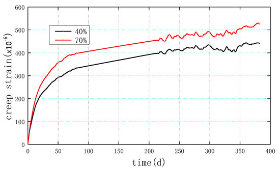 The creep value at the loading age of 14 days and the load level of 70% were equal to previously reported ones [23]. However, the loading age implemented in this earlier study was 28 days, although the test loading level was 40% of the strength, and thus the loading age had a greater influence on the creep.