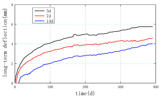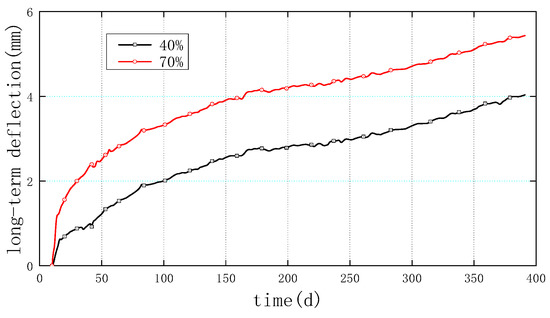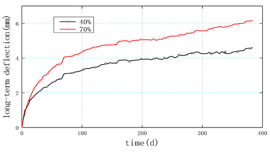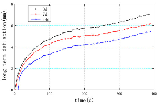 Figure 15, Figure 16 and Figure 17 illustrate the Time−history plots of the long-term deflections of RC T-beam specimens for 3-day, 7-day, and 14-day loading ages, respectively. The top and bottom curves in order are associated with the 40% and 70% loading levels. This shows that the greater the loading level, the greater the deflection. In addition, the two curves in the figure are adjacent to each other at the beginning of the loading time and gradually separate with the increase in the loading time. Hence, with the increase in the loading age, the load level has a greater impact on the long-term deflection.