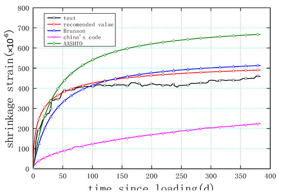 Shrinkage strain curves since loading based on AASHTO, Branson, Chinese code, the recommended, and tested value.