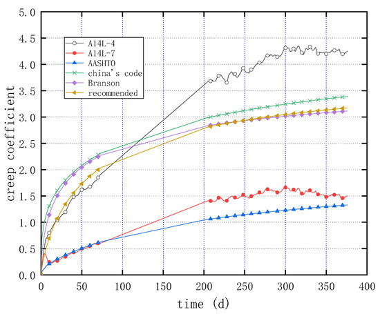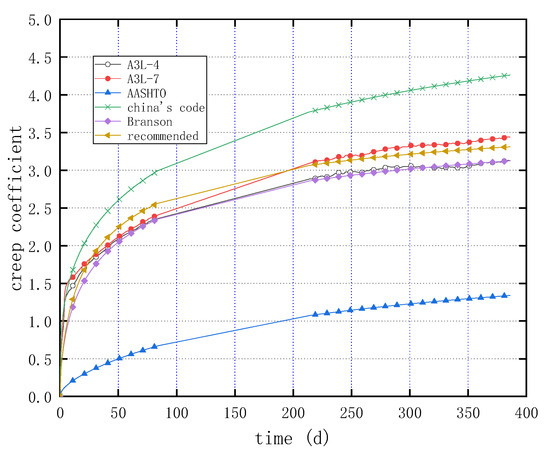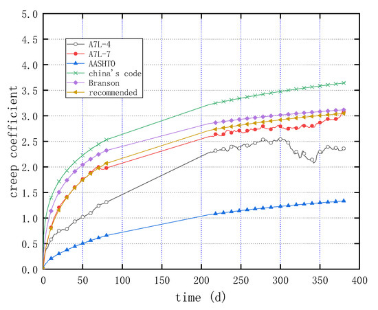The shrinkage strain curve obtained based on the Chinese code is the lowest. As mentioned above, the shrinkage test result is similar to the Chinese code result. However, the specification result is the ultimate value, whereas the test result is the value of 400-day loading time, and the specification ultimate value considers the 1000-day loading time. In fact, the test value is greater than the predicted value of the Chinese code, which may approximate the value obtained in an experiment conducted indoors, where the humidity is relatively low. The average humidity in this test is 36%, whereas the humidity considered by the Chinese code is 55%, which is beyond the scope considered by the Chinese code.