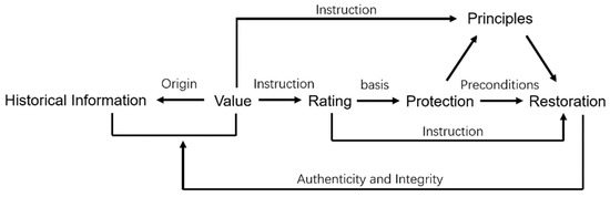 Article 3 of Chapter 1 of the Law of the People’s Republic of China on the Protection of Cultural Relics states that “immovable cultural relics such as ancient cultural sites, ancient tombs, ancient buildings, cave temples, stone carvings, murals, important historical sites and representative buildings of modern times, according to their historical, artistic, and scientific value, can be identified as national key cultural relics protection units, provincial cultural relics protection units, and municipal and county cultural relics protection units.” This shows that the value of the high and low judgment determines the level of protection of the cultural relic’s protection units [42,43,44]. The hierarchical differences of different cultural heritage buildings also form the value hierarchy [13]. The difference in value determines the difference in the grade of heritage buildings, and the grade determines the measures of protection and governance (Figure 2). Therefore, the immovable cultural relics selected for the article mainly involve national key cultural relics’ protection units, provincial cultural relics’ protection units, municipal cultural relics’ protection units, and general immovable cultural relics, which are set to four grades of A/B/C/D, respectively, according to the value of the grade evaluation.