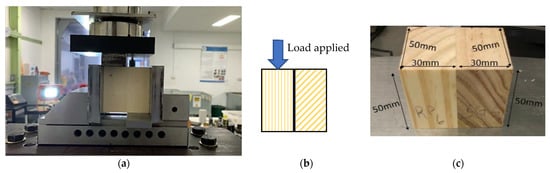 Block shear tests were carried out using a custom-designed rig, as shown in Figure 3a. EN16351 (Annex D) [] was followed for the block shear testing. Samples were supported laterally to ensure that pure shear forces were acting at the interface. The load was applied using a 300 kN INSTRON universal testing machine at a displacement control rate of 0.25 mm/min until the bond surface was sheared. For both the PAL and PER configurations, a compressive load was applied parallel to the grain direction, as shown in Figure 3b. In the RP–SG scenario, the Radiata Pine board was kept parallel to the force direction (Figure 3c) where the load was applied. In addition, for the perpendicularly glued boards, an RT plane was used in all scenarios, as illustrated in Figure 3c.