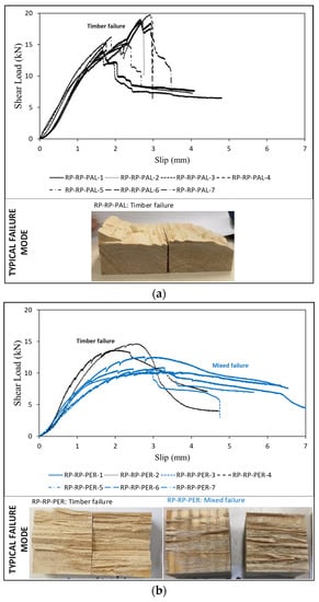 Figure 4 shows the loading curves for all tested RP–RP samples that were bonded in both parallel-to-grain (PAL) and perpendicular-to-grain (PER) directions.