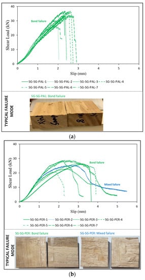 The typical failure mode for tested hardwood SG–SG–PAL samples was observed to be bond failure. All samples failed with clear interface delamination at the bond line, as shown in Figure 5a. The observed type of failure was characterised by delamination of the entire bond interface without damage of woodside areas. This phenomenon could be caused by insufficient penetration of the adhesive into the wood components as a result of the denser microstructure of hardwoods, which makes the penetration progress relatively more difficult than in softwoods; therefore, the bond line becomes the weakest link contributing to the delamination during loading. Obtained curves showed a constant slip pattern with a nearly linear increase in load-up to the peak point followed by a sharp decline, indicating the delamination of the bond interface. The ultimate shear loads for SG–SG–PAL samples were in the range of 26.24–36.99 kN, showing an average shear load of 33.42 kN and a COV of 0.110, whereas relevant initial stiffnesses were 17.22–22.48 kN/mm, with a mean value of 19.91 kN/mm and a COV of 0.093.