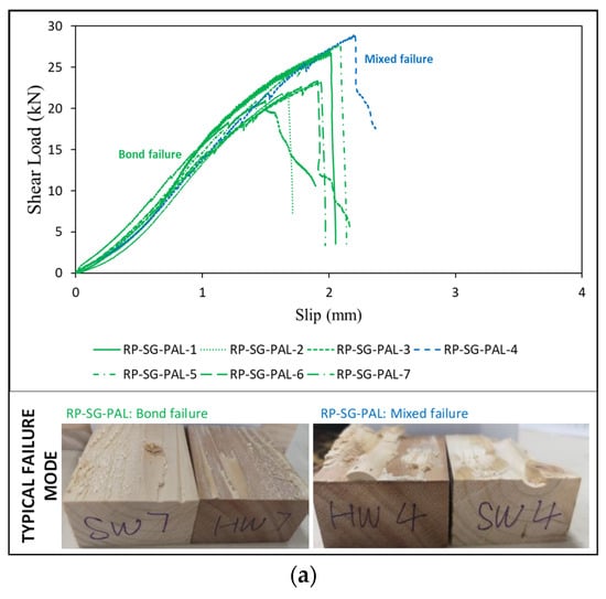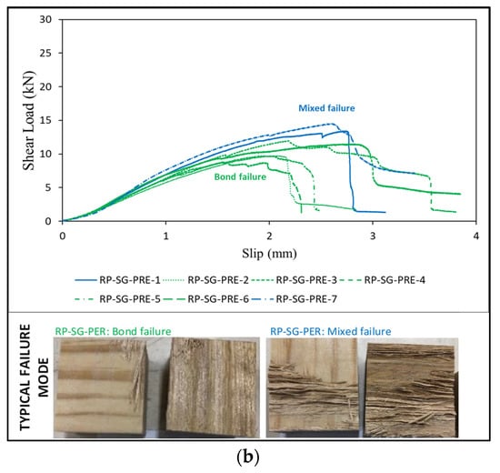 For the RP–SG–PAL category, six out of seven samples showed typical bond failure modes, and the other sample showed a mixed mode failure. Obtained curves for these RP–SG–PAL samples (Figure 6a) showed similar deformation histories to those of hardwood SG–SG–PAL samples (Figure 5a). The range of ultimate shear load recorded from the tests was 20.95 kN–28.89 kN, giving an average value of 24.73 kN and a COV of 0.116, whilst the relevant initial stiffness was found to be within the range of 15.45–20.39 kN/mm, with a mean value of 17.24 kN/mm and a COV of 0.090.