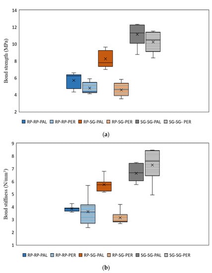 Figure 7 shows the box-and-whisker plots of shear bond strength (Figure 7a) and bond stiffness (Figure 7b) for all the tested samples. The PAL samples are solid-filled, whilst the PER samples are pattern-filled with horizontal strips. Relevant mean and characteristic values are summarised in Table 3.