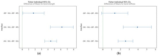 Furthermore, post hoc analysis using Fisher’s least significant difference (LSD) method was conducted for pairwise comparison, as shown in Figure 8a. It shows the difference in means while comparing three combinations at a 95% confidence interval. The corresponding means can be considered significantly different, as the confidence interval does not contain zero. Therefore, the lamellae combination is found to significantly affect bond strength.