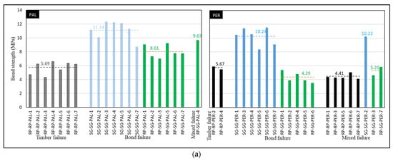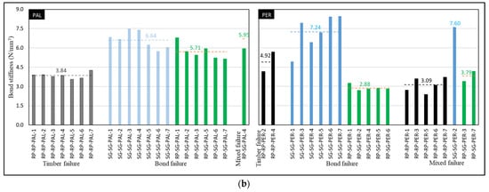 Figure 9 shows the shear bond strength (Figure 9a) and bond stiffness (Figure 9b) for all the tested samples. RP–RP, SG–SG and RP–SG samples are illustrated in black, blue and green, and are classified by failure modes following Section 3.1. Since the scope of this section is on the effects of failure modes, only groups with samples exhibiting multi-failure modes will be discussed. In other words, the RP–RP–PAL group (all timber failure) and the SG–SG–PAL group (all bond failures) are out of consideration and are marked in lighter colours in Figure 9.