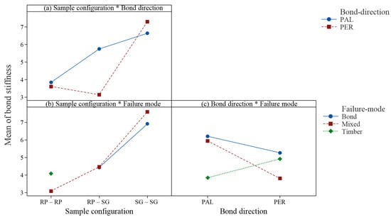 Interaction effects considering lamellae configurations, bond directions and failure modes are further investigated. Figure 10 and Figure 11 show the interaction plot for bond strength and bond stiffness, respectively.