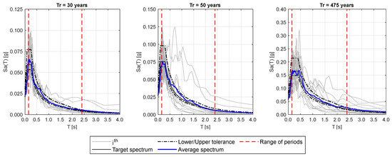 47]. Spectrum compatibility according to the Italian building code requires that the average response spectrum ordinate of the seven selected records, obtained with a damping coefficient of 5%, is not lower by more than 10% or higher by more than 30% than the corresponding spectral ordinate of the reference spectrum, in a range of periods of interest for the building and for the considered return period of the seismic action.