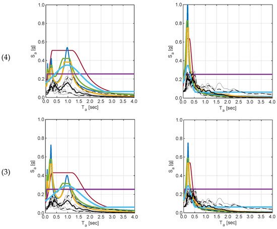 The comparison of the median spectra at the different levels and the corresponding code floor spectra highlights that in most cases, the code spectra envelop the results of numerical analyses in both directions. The fact that the code floor spectra envelop the results obtained from analyses with a limited set of records is somehow expected, as they are defined to account for different sources of variability, including record-to-record variability, structural characteristics (e.g., irregularity, nonlinear behavior, higher mode effects), nonlinear elements properties, and so on, which are not accounted for or not relevant in the analysis of the single considered case study. This is more evident at the higher stories and in the X direction (plots on the left in the figure). In the Y direction, the periods associated with predominant modes are associated with higher modes. For this reason, the code spectra have an amplification range narrower and higher than the one associated with the X direction.