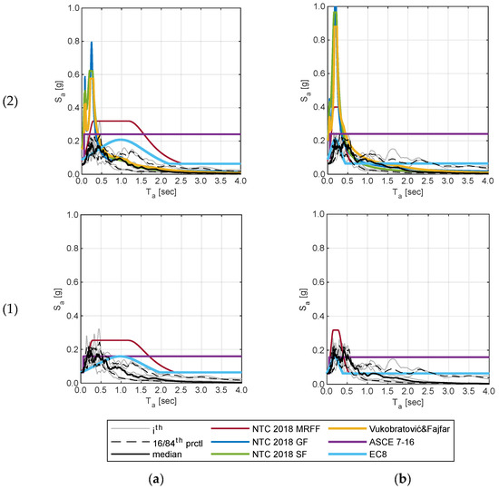 Figure 7 shows the floor spectra obtained at the different levels of unit A from analyses with the seven selected records and considering 5% damping. The median (black thick line) and 16/84th percentile (black dashed lines) spectra obtained from the records are also compared with the floor spectra calculated according to NTC [