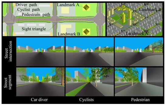 - The riding viewpoint was 1.75 m from the ground height, the viewpoint spacing was 30 m, and the playback speed of the dynamic snapshot corresponded to the riding speed, 10 km/h;