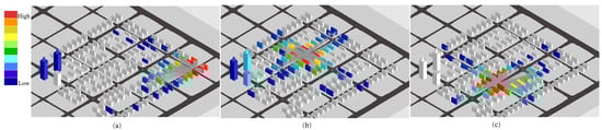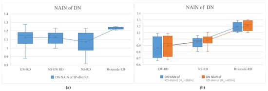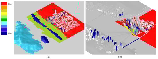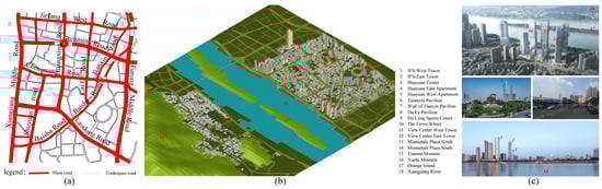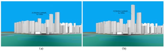 - XD-District, a typical area pattern formed mainly by high-rise building groups; the height of the proposed A2-Beichen Landmark was 268 m (Figure 11a), with Ha2 = 268 m as the default in the later text;