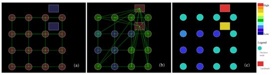 | district | The visibility measure expressed in terms of decision nodes and landmarks is the morphological feature of the region. Differences in the morphology of the region lead to differences in the shading relation between the landscape resources of the regional landmarks and the surrounding environment. It is difficult to obtain good structural salience for landmarks with excessive occlusion of the environment. |