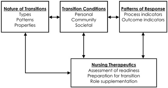 Four domain constructs define transitions theory, viz, (1) nature of transitions; (2) transition conditions; (3) patterns of response; and (4) nursing therapeutics [10,11]. The relationship between these constructs is illustrated in Figure 1.