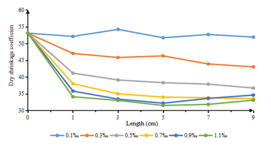 However, the above trends were affected by the fiber length, especially when the fiber content ranged from 0.7‰ to 1.1‰. When the fiber content increased from 0.1‰ to 0.7‰, the dry shrinkage coefficient of cement-stabilized concrete decreased by 4.1%, 4.9%, 5.1%, 5.2%, and 5.3% on average for every 0.1‰ increase in fiber content, respectively, in the case of the fiber length of 1 cm, 3 cm, 5 cm, 7 cm, and 9 cm. These reduction rates were 2.6%, 1.4%, 1.8%, 1.5%, and 0.3% when the fiber content ranged from 0.7‰ to 1.1‰.