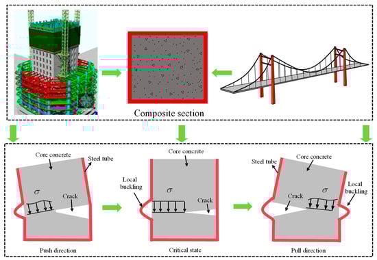 Concrete-filled steel tube (CFST) columns possess the advantages of high bearing capacity, large stiffness and excellent ductility [], and are often used as the vertical and horizontal load-bearing structure members in bridges and high-rise building structures, as shown in Figure 1. In the past few decades, many numerical calculation methods have been proposed in order to estimate the static performance, cyclic behavior, as well as the fire resistance behavior of CFSTs, such as existing 3D finite element methods, secondary development based on existing numerical software ABAQUS and OpenSees, and the fiber element model. Compared with the three-dimensional finite element method, the fiber model has been considered a highly efficient algorithm in the state of only uniaxial compression, especially for nonlinear calculations of complicated engineering structures. For CFSTs, the fiber element model can predict their static behaviors, including axial compression behavior [,] of stub columns, axial compression behavior and eccentric compression behavior [,,,] of slender columns, as well as pushover analysis []. In addition, it can also be used for evaluating the fire resistance behavior [], as well as the hysteresis behavior [,,,] of CFSTs. Generally, there have been mainly two methods to handle the local buckling of steel tubes in the fiber element model: the first method is to modify the yield stress, the stress–strain skeleton curve and the hysteretic criterion of steel in advance, according to the sectional width to thickness ratio [,,]. Another method is to introduce the concept of effective distribution width that is calculated according to the sectional stress state [,,,]. At present, there is still relatively little research on the cyclic behavior of CFSTs, with local buckling considered by using the fiber element model [,,,]. In addition, once the local buckling occurs, the partial areas nearby the web are out of work, and the phenomenon of redistribution of the stress in the section occurs, leading to the stress borne by the web being transferred to the flange. On the other hand, by modifying the stress–strain skeleton curve, as well as the hysteretic criterion of steel in advance, can not really reflect the actual stress in the section and the behavior of local buckling [,,].