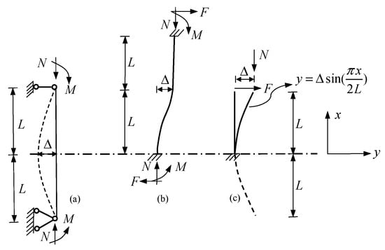 The fourth assumption is reasonable for the members with both ends hinged, as shown in Figure 3a, which can be utilized for the calculation of UHPCFST members under axial compression or eccentric compression. Figure 3b,c are the simplified calculation of reverse bending point of columns under the different restrict boundary. As for the frame column in Figure 3b with both ends fixed and a lateral displacement of one end, the inflection point is in the middle of the column. Therefore, from the inflection point to the fixed end, it can be simplified as a cantilever member with a geometric length L, as shown in Figure 3c. If the influence of lateral load on the lateral deflection curve can be ignored, the cantilever member can be equivalent to the members with both ends hinged, as shown in Figure 3a.