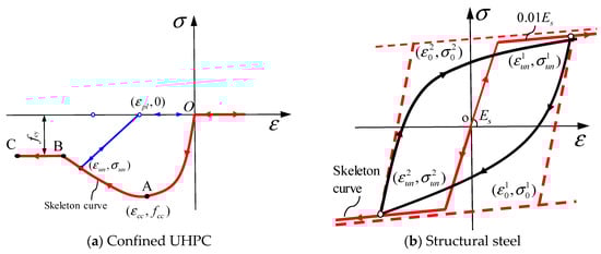 There are various forms of stress–strain models for constrained concrete [,], and the constitutive relationship of constrained UHPC is the basis for the numerical research on the seismic performance of UHPC-filled rectangular high strength steel tube columns in this paper. For the rectangular section, the constitutive model of the constrained concrete is shown in Figure 4a, which incorporates the skeleton curves and the hysteretic rules. The skeleton curve of constrained concrete proposed by Han [] is used in this work and the formulas are given by Equations (5)–(7):