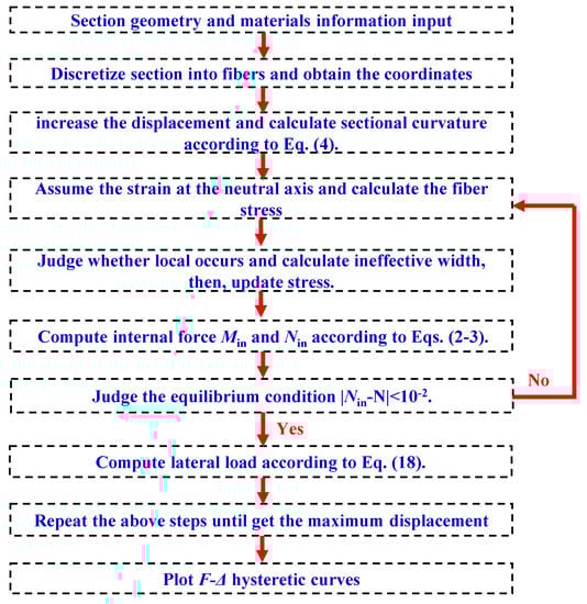 In the calculation, the maximum compressive stress σ1 at the edge of the cross-section flange is firstly obtained, which is greater than σcr. Then, the ineffective width can be calculated according to Equation (17) and the stresses of the steel fibers within it can be updated as zero until they reach the maximum ineffective width.