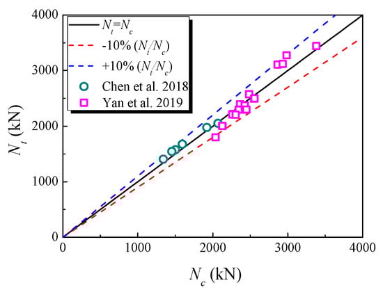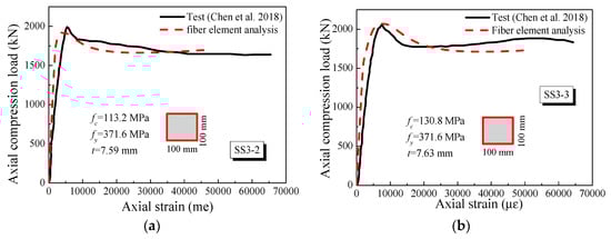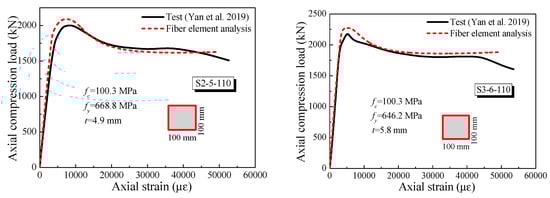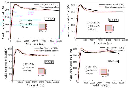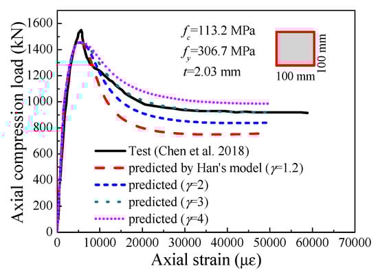 The full axial compression load–strain (N-ε) curves of specimen SS2-2 with different γ values are shown in Figure 7. The result of the experiment is also plotted in Figure 7. It can be easily concluded that the ascending branch of the full N-ε curve can be well predicted by Han’s model, whilst it is inaccurate for the descending branch. It is obvious that the residual bearing capacity and the post-peak ductility of the stub UHPCFST column are greatly underestimated by Han’s model. Therefore, the descending branch of the stress–strain curve of concrete in Han’s model needs to be revised. The parameter γ in Equation (7) is a key factor to affect the post-peak ductility and residual stress of concrete, and it is taken as 1.2 in Han’s model. In the present work, the fiber element result is compared with the test result by adjusting the value of γ (γ = 1.2, 2, 3, 4) of the stub UHPCFST column. It is found that when γ value is taken as 3, the descending branch predicted by the fiber model is in good agreement with the experimental results, and it can well predict the post-peak ductility and the residual bearing capacity of the stub UHPCFST columns. It can be also seen from Figure 8 and Table 1 that the bearing capacities calculated by the fiber model are shown to agree with test results. Except for specimen S1-5-100, the errors between them are within the range of 10%, whilst for specimen S1-5-100, the error between the fiber model and the test result is 13%. This may be due to the uncertainty of the actual strength of UHPC.