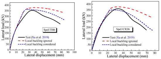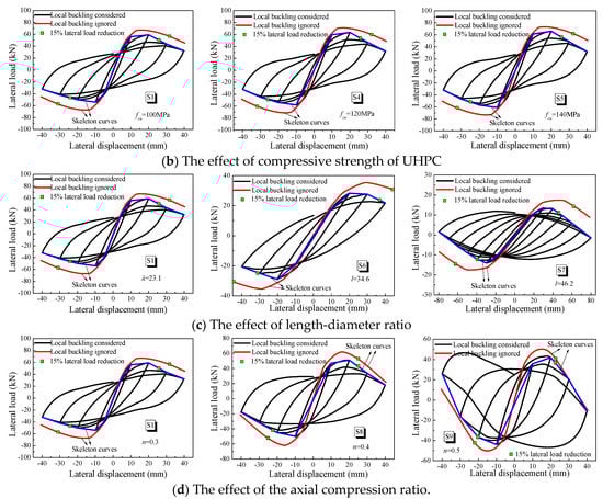 The cyclic load testing is an effective means of evaluating the seismic performance of structures and members. So far, there is limited research on the cyclic behaviors of UHPCFST columns. The seismic performance of the UHPCFST columns under combined axial compression and cyclic lateral loading has been investigated by Xu et al. [] and Cai et al. []. The details of the specimens are summarized in Table 2. The lateral load–displacement skeleton curves of the positive direction of the UHPCFST columns with local buckling considered or not considered are showed in Figure 11, and the corresponding test results are also plotted in Figure 11. As illustrated in Figure 11, the local buckling has a significant impact on the bearing capacity and the ductility of the UHPCFST columns. The larger bearing capacity as well as stiffness (after local buckling occuring) of The UHPCFST columns will be provided if local buckling is neglected. In addition, neglecting the local buckling will greatly overestimate the post-peak ductility of the UHPCFST columns. The reason for this result is that the compressive strength of UHPC is far higher than normal concrete, and the partial area of the cross-section will be out of work when the local buckling of steel tubes occurs, which consequently weakens the restraining effect of steel tubes on the core UHPC and results in a significant reduction of post-peak ductility. The descending branch of the lateral load–displacement curves in Figure 11 are more steeper if the local buckling is considered, and the post-peak ductility is worse, which is closer to the test results.