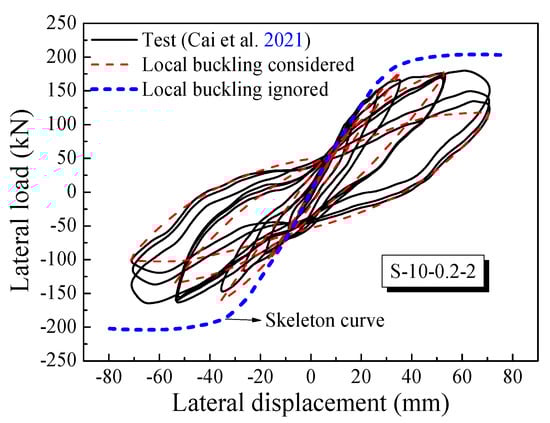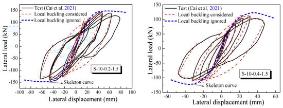 The lateral load–displacement hysteretic curves of the test, and which were predicted by the fiber element model with the local buckling considered, are shown in Figure 12. The skeleton curve, without considering the influence of local buckling, is also plotted in Figure 12. As illustrated in Figure 12, similarly taking no account the local buckling of steel tubes overestimates the bearing capacity and post-peak ductility of UHPCFST columns under cyclic loading, which will lead to the insecurity of structures. The bearing capacities of specimens named S-10-0.2-1.5 and S-10-0.4-1.5 are overestimated by 3.2% and 11.8%, respectively, and this phenomenon tends to be increased with the increase in the axial compression ratio. In this work, the bearing capacities and the post-peak ductility with local buckling considered are in good agreement with experimental results. The errors of the maximum bearing capacity between the fiber model and the test results in Table 2 are within the range of 10%. However, for the unloading branch and reloading branch, there are a few differences in the local area between the fiber model and the test results. This may be attributed to the fact that the UHPCFST columns are ideal consolidation models (one end fixed to the ground) on the ground in the fiber model, whilst this is not the case in the experiment.